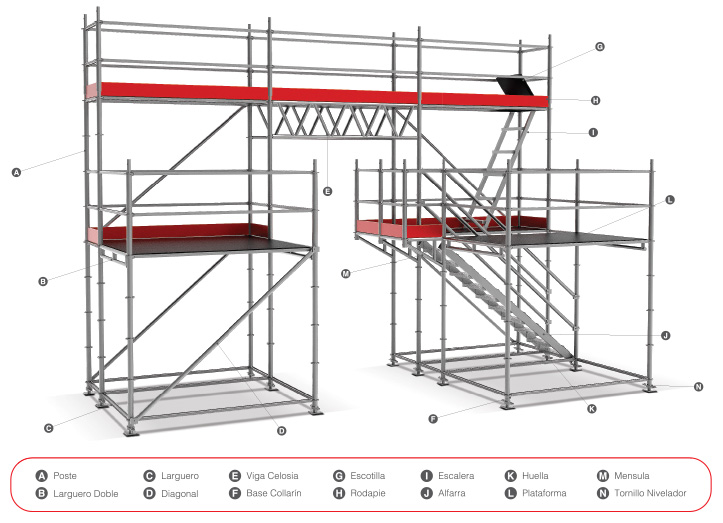 Es el sistema de andamiaje más flexible e innovador. Por la ingeniosa forma de unión y ensamble de sus piezas basado en una roseta de unión y cierre con cuña es posible dar cualquier forma y ángulo al sistema de manera completamente segura.Puede armarse acorde a la necesidad de la obra brindando mayor precisión.